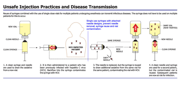 Backflow from the patient’s intravenous catheter or from needle removal might have contaminated the syringe with HCV (hepatitis C) and subsequently contaminated the vial. Medication remaining in the vial was used to sedate the next patient.