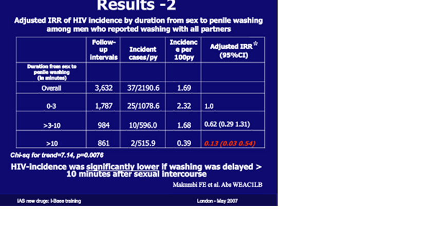 This is one of the slides showing that there were 2.32 HIV infections per 100PY among men who washed their penis within 3 minutes of intercourse, but only 0.39 infections per 100PY among men who waited for 10 minutes or longer before washing.